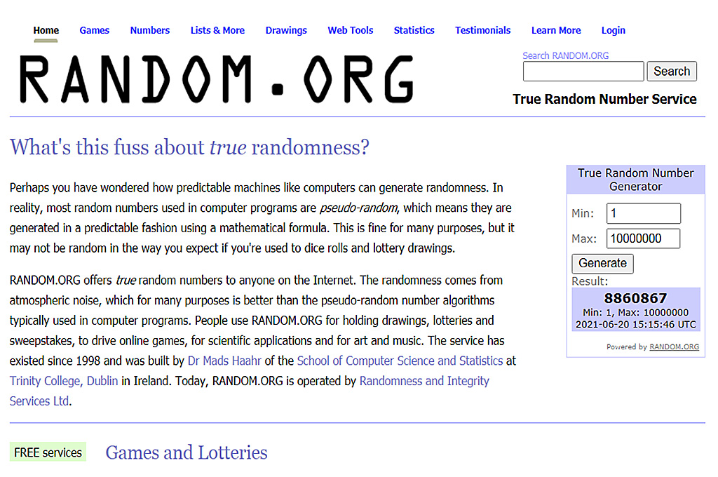 This site offers true random numbers to anyone on the Internet. The randomness comes from atmospheric noise, which for many purposes is better than the pseudo-random number algorithms typically used in computer programs.