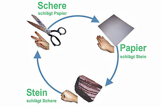 Schere, Stein, Papier (auch Schnick, Schnack, Schnuck) ist ein sowohl bei Kindern als auch Erwachsenen beliebtes und weltweit verbreitetes Spiel.